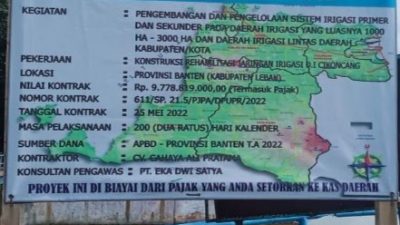 Lebak, UNB.- Pekerjaan rehab irigasi D.I Cikoncang yang dikerjakan sejak beberapa bulan lalu masih jauh dari kata selesai, proyek pengerjaan rehab irigasi tersebut yang menelan anggaran sebesar Rp 9.778.819.000 dari APBD Provinsi Banten TA 2022. Yang dikerjakan oleh kontraktor CV CAHAYA ALI PRATAMA, dengan Konsultan Pengawas PT EKA DWI SATYA dengan nomor kontrak 611/SP.21.5/PJPA/DPUPR/2022.