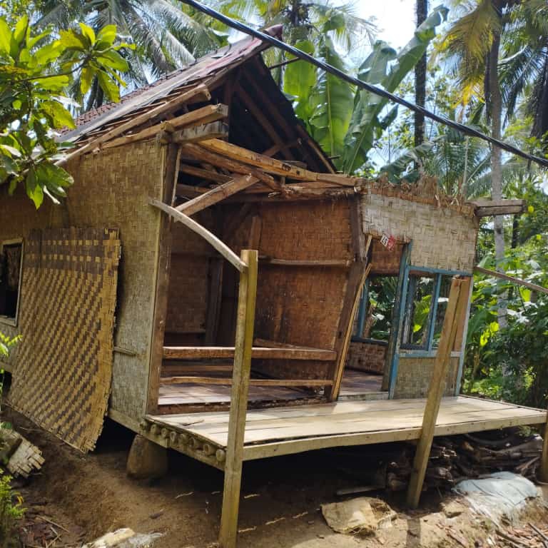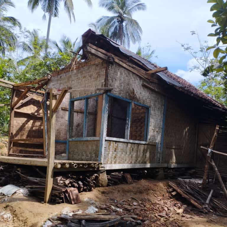 LEBAK, UNB.- Nenek Junaeni (85) warga kampung Cidangdang RT 12 RW 04 Desa Cipeundeuy, Kecamatan Malingping, kini rumahnya hampir tidak bisa dihuni lantaran tertimpa pohon kelapa yang roboh saat angin kencang Senin (22/1/2024) yang lalu.
